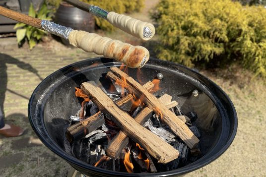 パン生地を棒に巻き付けて焚き火で焼くと、